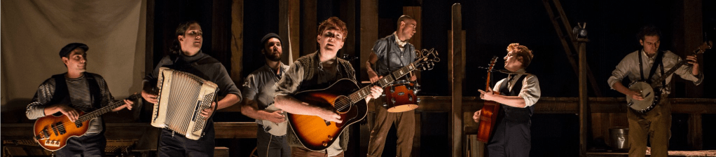 The ensemble cast of seven Carnegie-Mellon grads–who developed the story while still in school–deliver a tale that delves into the ideas of devotion, adventure, memory and that most theatrical of emotions: love. They are a talented chorus of storytellers, each with a great voice and each picking up different instruments, seven Orpheus’ singing ahead of their Eurydice, The Story. Think a banjo and a fiddle, drums and guitars. It’s as if Mumford and Sons— completely donned in chambray and chinos, striped henleys and vests–decided to become thespians on the Off-Broadway stage. In addition to a great cast, the lighting design and the set was magnificent. The entire thing felt low-fi but at the same time, inspired the audience to use its imagination to the fullest. Above all else, it was masterfully childlike.
